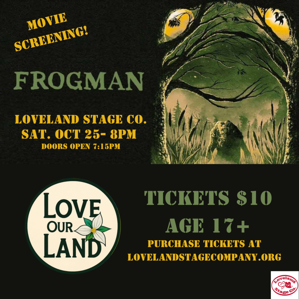 Dare to step into the shadows and experience the eerie legend of the Loveland Frogman at a hauntingly unforgettable film screening that’s sure to awaken your Halloween spirit. Join us on Saturday, October 25th at 7 PM for a chilling night filled with mystery, folklore, and frights—recommended for ages 17 and up. Tickets are just $10, with all proceeds supporting two great local causes: Love Our Land and the Loveland Stage Company. This is one spooky evening you won’t soon forget… if you dare.