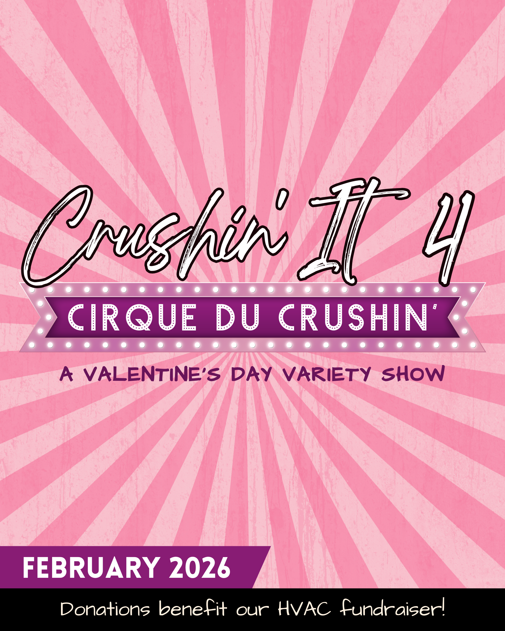 Crushin' It is a Valentines-themed variety event featuring songs, dance, comedy, games, and plenty of surprises. Your valentine will fall head over heels for flowers, candygrams, and heartstopping live entertainment. You can even enter to win a cupid-approved raffle basket! This production is a fundraiser for the local theater, and 100% of proceeds go towards a new HVAC system... so please save the DATE!